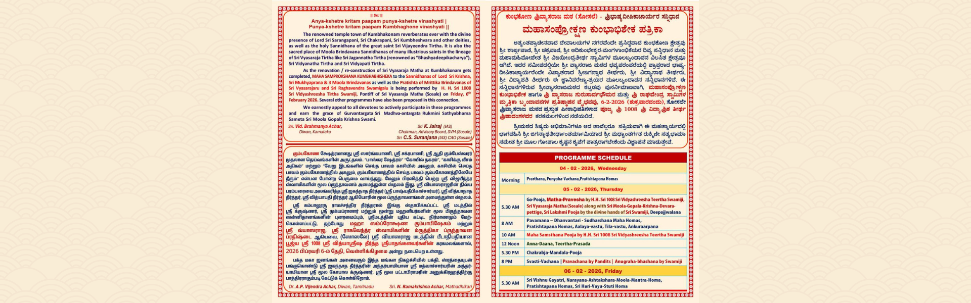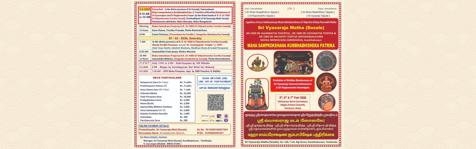 The renowned temple town of Kumbhakonam reverberates ever with the divine presence of Lord Sri Sarangapani, Sri Chakrapani, Sri Kumbheshwara and other deities, as well as the holy Sannidhana of the great saint Sri Vijayendra Tirtha. It is also the sacred place of Moola Brindavana Sannidhanas of many illustrious saints in the lineage of Sri Vyasaraja Tirtha like Sri Jagannatha Tirtha (renowned as “Bhashyadeepikacharya”), Sri Vidyanatha Tirtha and Sri Vidyapati Tirtha. As the renovation / re-construction of Sri Vyasaraja Matha at Kumbhakonam gets completed, MAHA SAMPROKSHANA KUMBHABHISHEKA to the Sannidhanas of Lord Sri Krishna, Sri Mukhyaprana & Sri Moola Brindavanas as well as the Pratishta of Mrittika Brindavanas of Sri Vyasaraja and Sri Raghavendra Swamigalu is being performed by H. H. Sri 1008 Sri Vidyashreesha Tirtha Swamiji, Pontiff of Sri Vyasaraja Matha (Sosale) on Friday, 6th February 2026. Several other programmes have also been proposed in this connection. We earnestly appeal to all devotees to actively participate in these programmes and earn the grace of Guruvantargata Sri Madhva-antargata Rukmini Sathyabhama Sameta Sri Moola Gopala Krishna Swami.